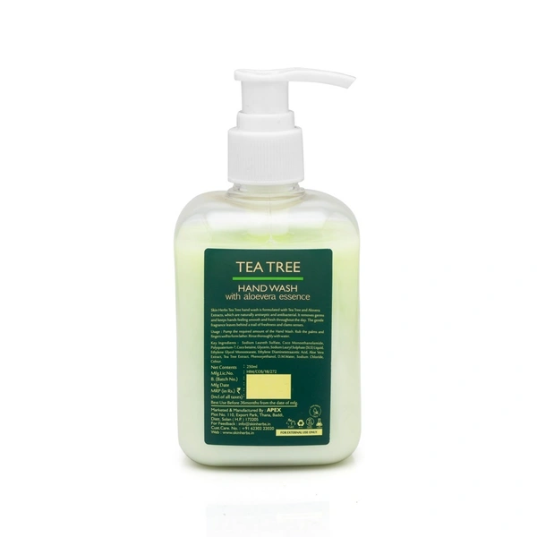 - With its refreshing scent and nourishing formula, our hand wash is perfect for daily use. Whether you're at home, in the office, or on the go, make it a habit to cleanse your hands with our Skin Herbs Tea Tree Hand Wash to ensure cleanliness, hygiene, and the overall well-being of your skin. Experience the difference of a hand wash that not only cleans but also cares for your hands, leaving them feeling rejuvenated and protected.